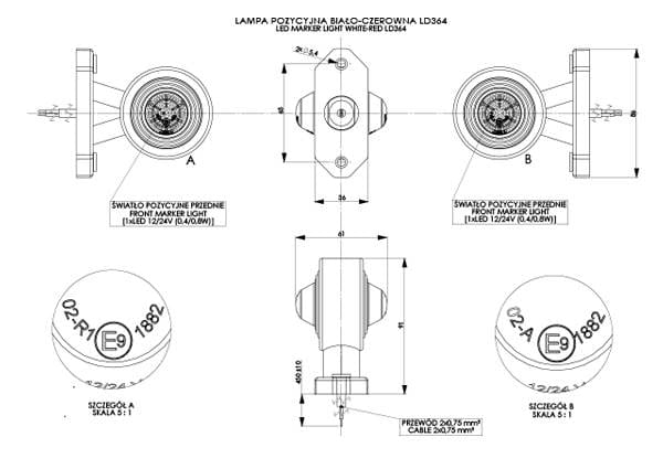 Lampa obrysowa diodowa na wysięgniku krótkim, biało-czerwona LD 364