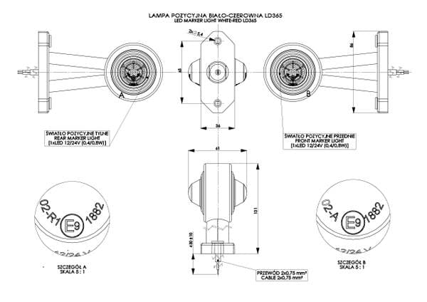 Lampa obrysowa diodowa na wysięgniku długim prostym, biało-czerwona LD 365