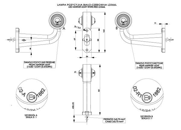 Lampa obrysowa diodowa na wysięgniku łamanym długim, biało- czerwona LD 366