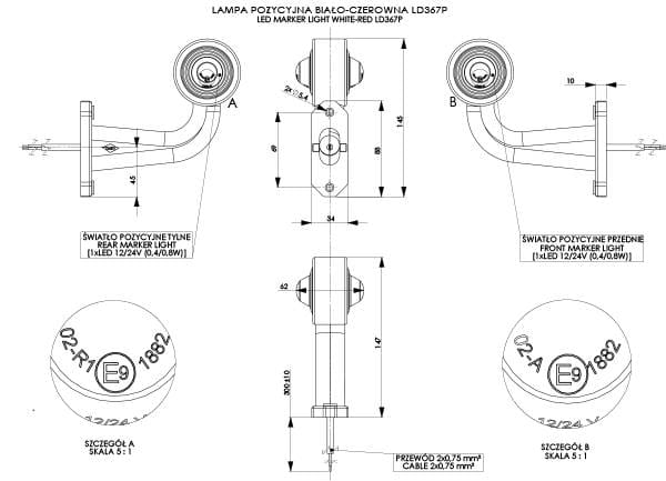Lampa obrysowa diodowa na wysięgniku łamanym krótkim, biało-czerwona LD 367