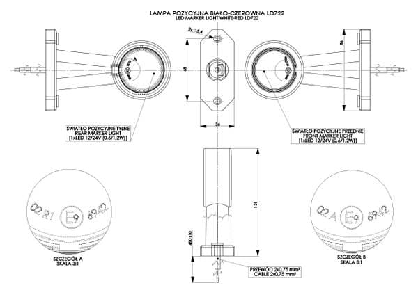 Lampa obrysowa biało-czerwona, na wysięgniku długim prostym LD 772