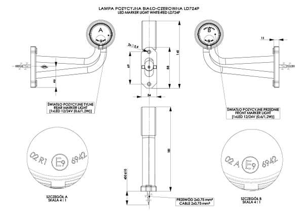 Lampa obrysowa biało-czerwona, na wysięgniku długim łamanym LD 724