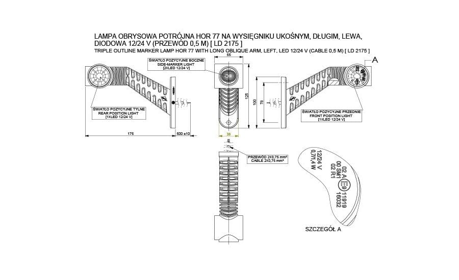 Lampa obrysowa LD 2175 Lampa obrysowa potrójna na wysięgniku ukośnym, długim, lewa (przewód 0,5 m) 12V/24V