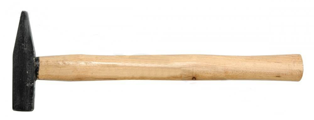 Tradycyjny młotek ślusarski osadzony na drewnianym trzonku. Obuch stalowy, kwadratowy, ścięty ukośnie, lakierowany na kolor czarny. Trzonek z drewna sezonowanego, profilowany, zabezpieczony warstwą lakieru bezbarwnego.
