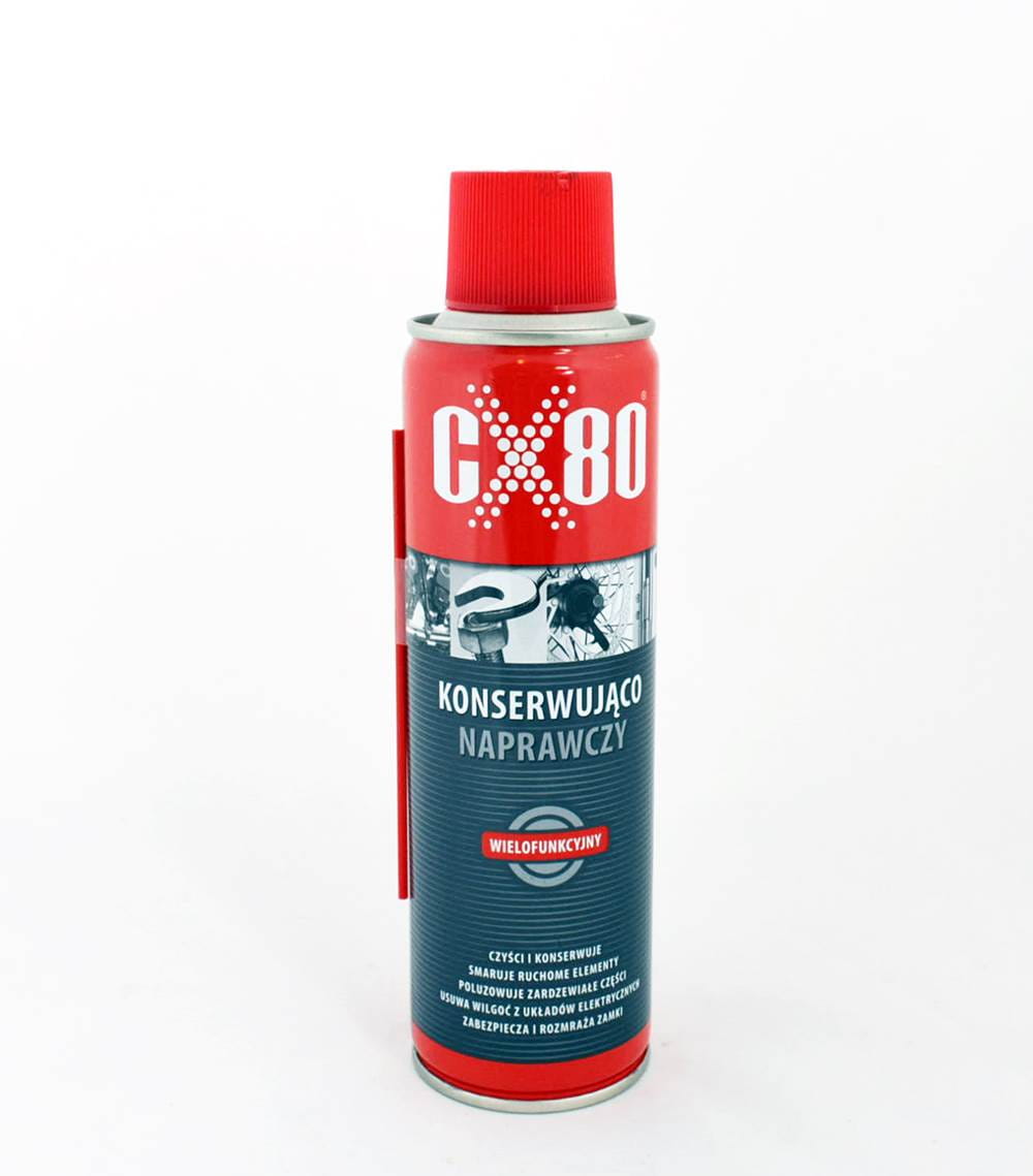 CX-80 płyn konserwująco-naprawczy smaruje, penetruje, usuwa wilgoć, czyści, konserwuje. Specjalna formuła preparatu wielozadaniowego wyprodukowana z najwyższej jakości surowców. Szybko rozluźnia zardzewiałe i zapieczone elementy. Czyści i zabezpiecza urządzenia przed rdzą. Usuwa piski i skrzypienia zawiasów, zamków, karniszy i innych urządzeń mechanicznych. Poprawia działanie układów zapłonowych narażonych na zalanie lub wilgoć. Przenika pod warstwę wilgoci tworząc barierę ochronną pomiędzy wodą, a metalami. Eliminuje spięcia spowodowane wilgocią. Odpowiedni dla elektrycznego zapłonu.