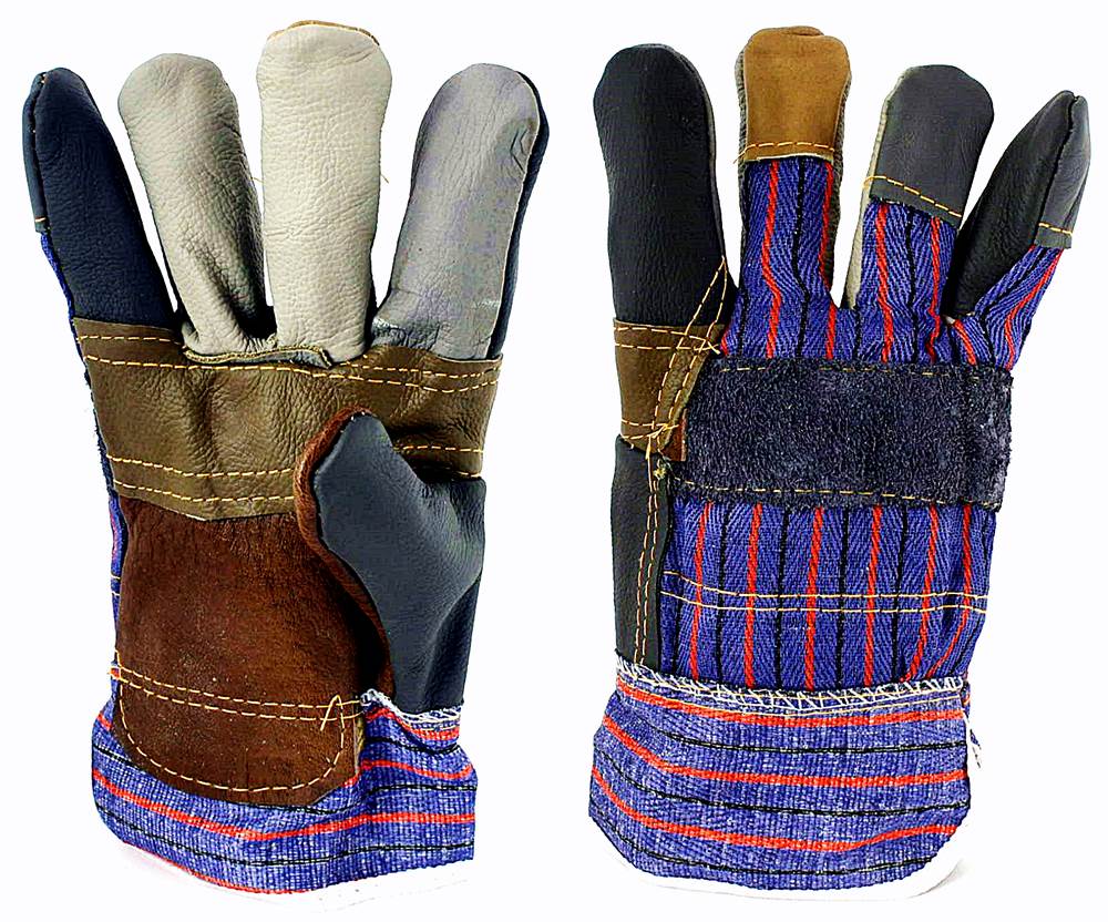 Rękawice ochronne wzmacniane różnokolorową skórą bydlęcą.