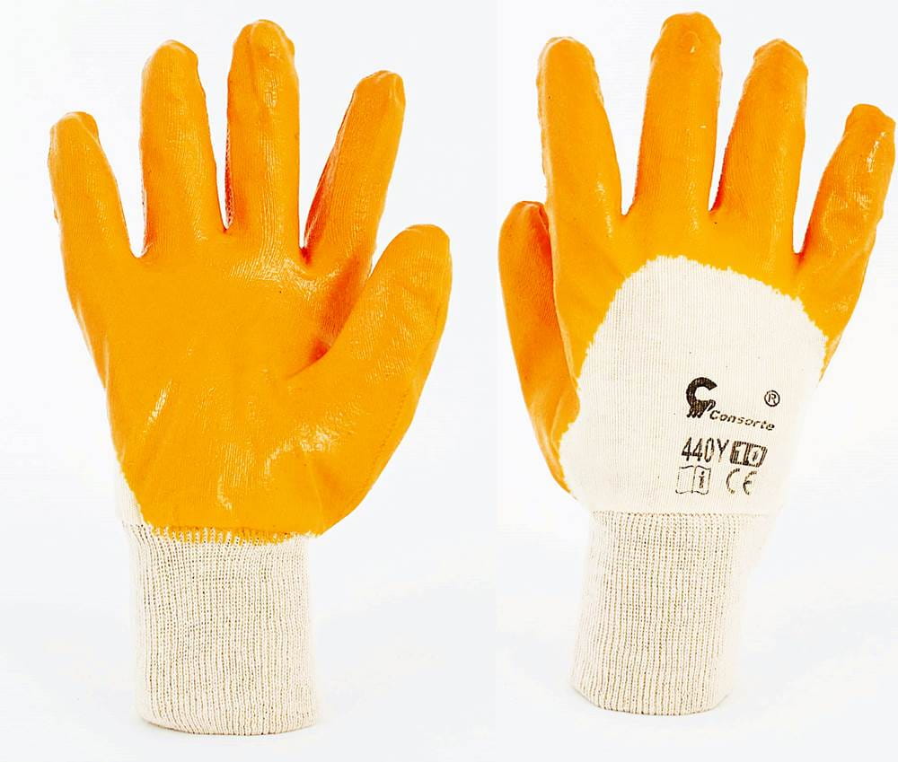 Rękawice powlekane lekkim nitrylem w kolorze żółtym. Zakończone ściągaczem.