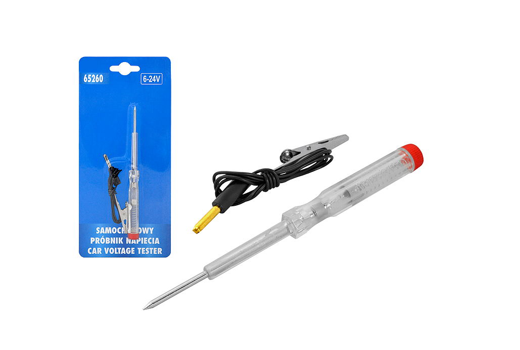 Wskaźnik napięcia przeznaczony do sprawdzania instalacji w pojazdach mechanicznych wyposażonych w instalację o napięciu 6 - 24V. Wskaźnik posiada stalowy grot. Transparentna obudowa z tworzywa sztucznego. Żarówka diodowa sygnalizująca napięcie. Próbnik zaopatrzony jest w przewód podłączeniowy z krokodylkiem. Przewód ze złączką zaciskową.